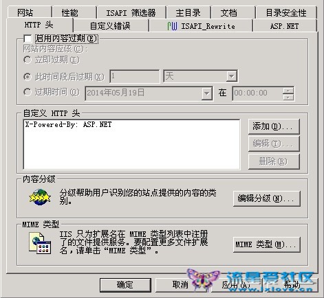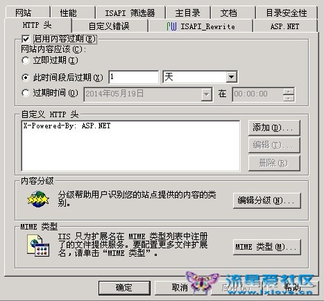 在IIS中定位到網(wǎng)站存放圖片的文件夾,然后打開屬性窗口,在HTTP Headers中做出如下選擇,要求組件的過期時(shí)間為本次請(qǐng)求后1天,也就是在本地緩存86400秒。