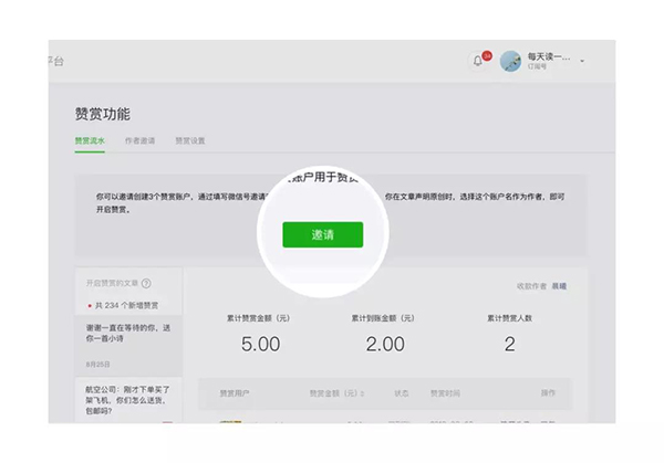 有邀請(qǐng)權(quán)限的公眾號(hào)在“贊賞功能”里填寫(xiě)微信號(hào)發(fā)送創(chuàng)建邀請(qǐng)。