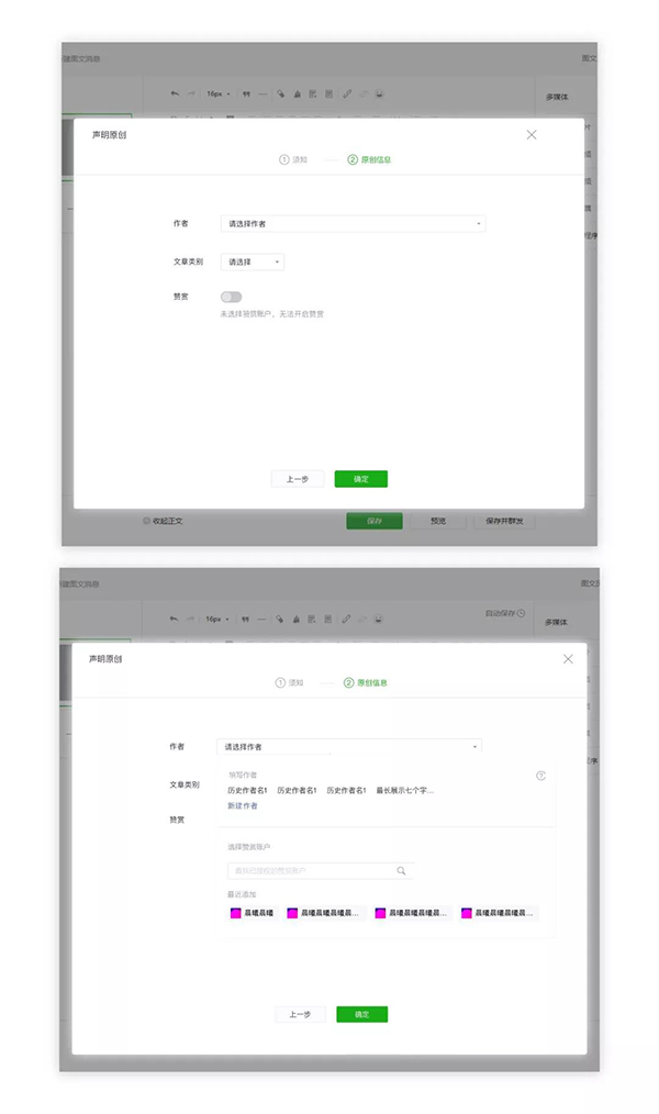 公眾號(hào)對(duì)文章聲明原創(chuàng)時(shí),輸入贊賞賬戶名進(jìn)行查找。選擇了贊賞賬戶的文章可以開(kāi)啟贊賞。