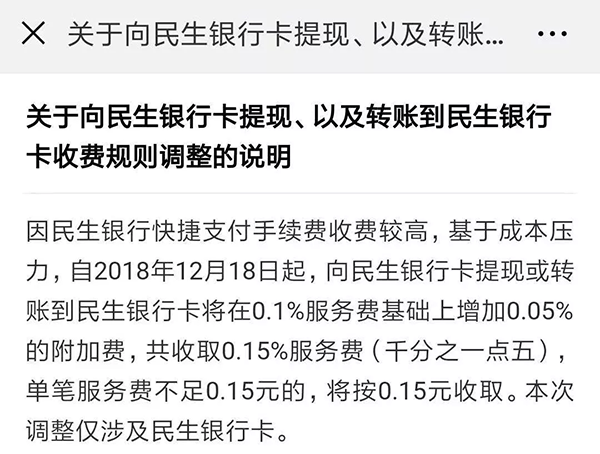 由于民生銀行快捷支付手續(xù)費收費較高,基于成本壓力,從微信零錢提現(xiàn)或轉(zhuǎn)賬到民生銀行卡需要在服務(wù)費0.1%的基礎(chǔ)上,加收0.05%附加費,共收取0.15%服務(wù)費(千分之一點五)。單筆服務(wù)費不足0.15元的,將按0.15元收取,本次調(diào)整僅涉及民生銀行卡,微信支付強調(diào)不會以收取提現(xiàn)服務(wù)費作為平臺的盈利手段。