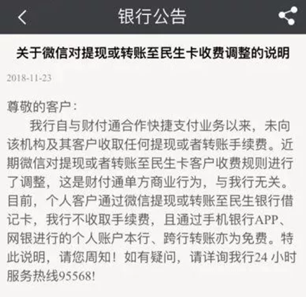 近日微信發(fā)布了一則公告稱:自2018年12月18日開始,民生銀行卡體現(xiàn)和轉(zhuǎn)賬將在加收0.05%手續(xù)費,對此,民生銀行發(fā)布公告稱:收費為財付通單方面行為,與民生銀行無關(guān)……吃瓜群眾表示:和誰有關(guān)都不想付啊……