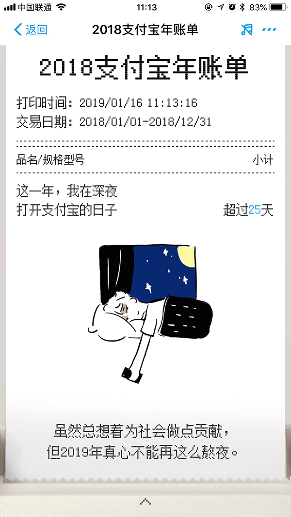 第一頁賬單統(tǒng)計(jì)了深夜打開支付的次數(shù),最后強(qiáng)調(diào)“2019年真心不能再這么熬夜”,關(guān)心到用戶的健康問題方面。