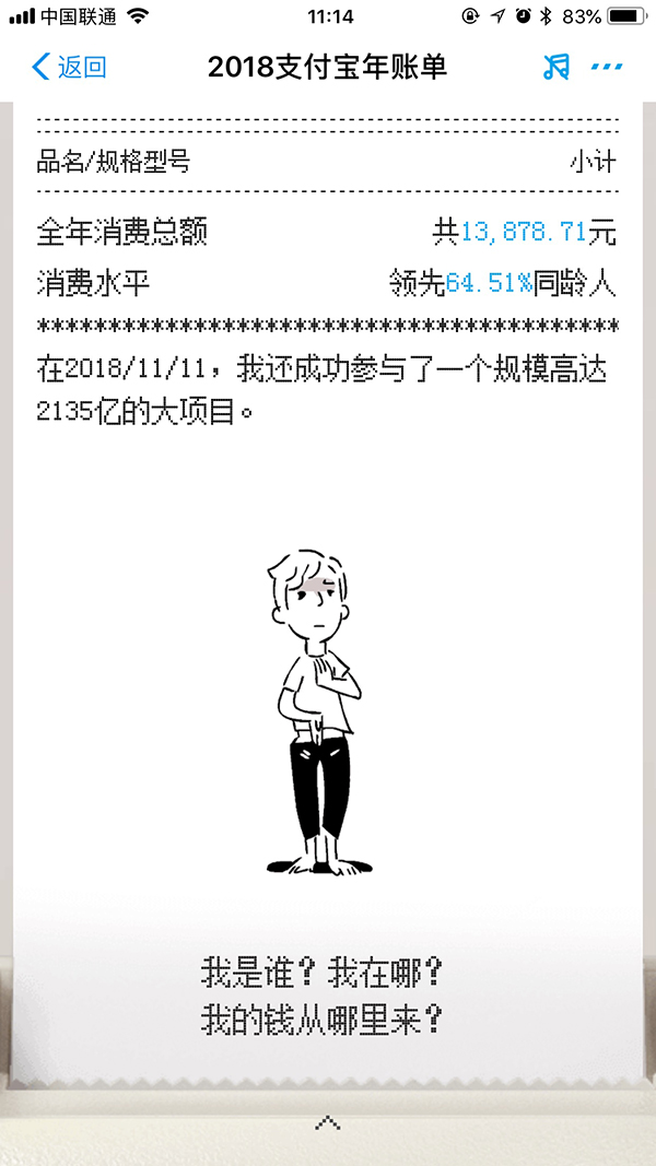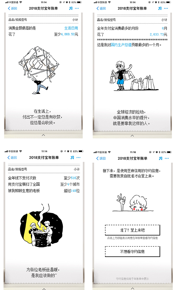 或許賬單會遲到,但卻永遠(yuǎn)不會缺席。上周,支付寶年賬單在微信朋友圈開始雙刷屏,自覺花錢如流水的網(wǎng)友,紛紛以各種“不忍直視!”的詼諧表達(dá)來調(diào)侃自己。不過,今年的支付寶賬單與往年有所不同,2018年度支付寶賬單采用了流水小票概念設(shè)計(jì),看上去相當(dāng)有創(chuàng)意,整個(gè)賬單就像一張從打印機(jī)中慢慢打印出來的購物小票,每一頁都配有相應(yīng)的簡筆畫。