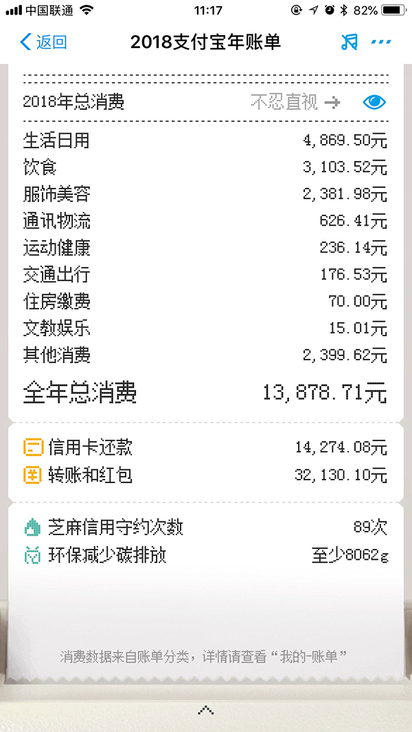 第二頁賬單統(tǒng)計(jì)了你去年一年的消費(fèi)總額,以及在全國用戶中的水平,這簡直就是一年中最為富有的時(shí)刻。