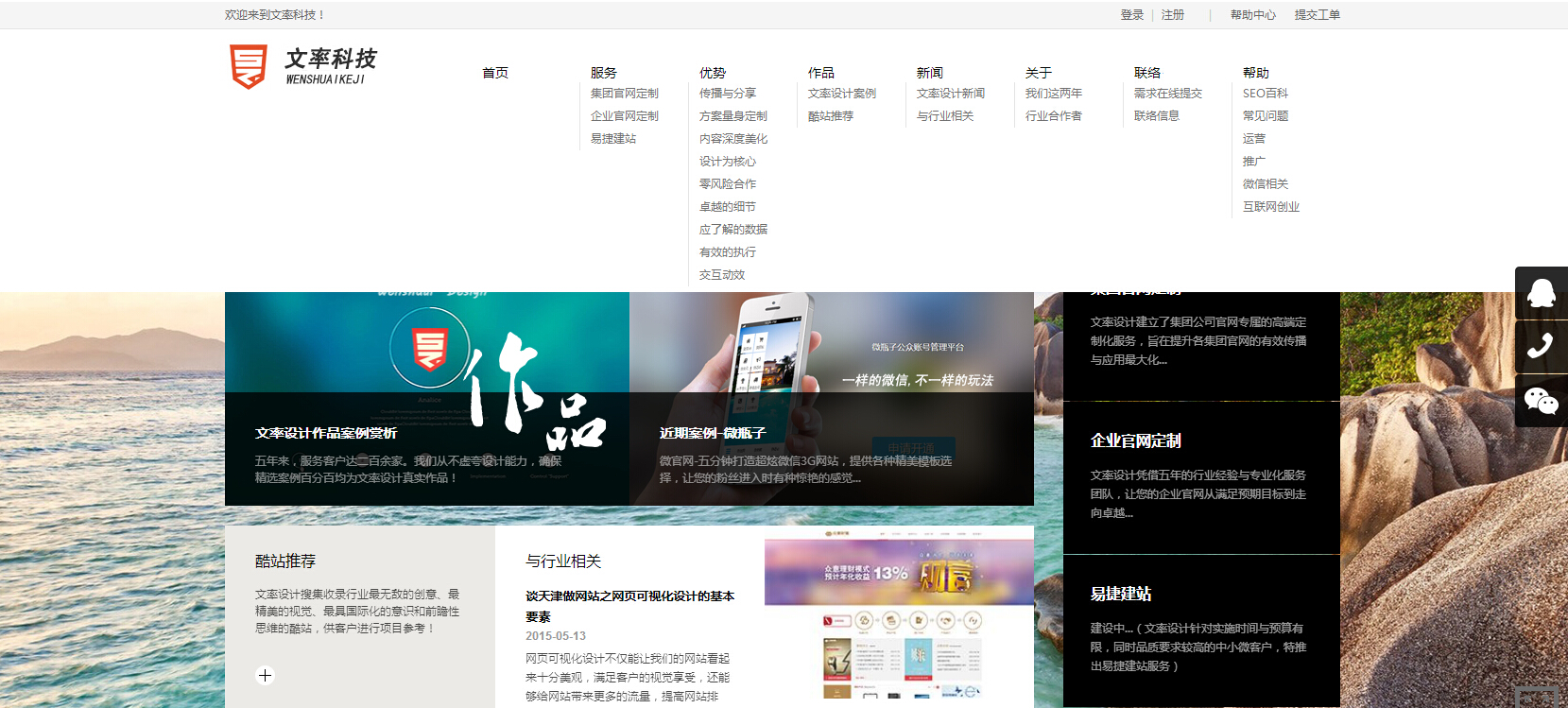 網(wǎng)站導航的設計要么千篇一律,沒有絲毫新意;要么千奇百怪,讓人無法理解;專注網(wǎng)站的網(wǎng)站導航設計應該站在客戶和企業(yè)的角度之上綜合進行考慮。首頁banner部分可讀信息過少等這些問題從優(yōu)化角度分析都是網(wǎng)站制作所忽視的問題。大家可以看下天津網(wǎng)站制作——文率科技的網(wǎng)站導航和首頁banner的設計簡單大方可讀信息多,非常有利于用戶體驗,同時很容易被百度蜘蛛抓取。