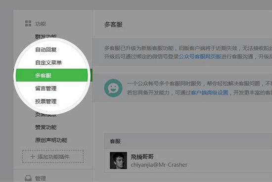 多客服功能是微信公眾平臺(tái)較早之前推出的功能,由于推出的時(shí)間較久,維護(hù)和迭代的成本較高,我們推出了新版的客服功能。舊版多客服將于近期正式下線,請(qǐng)公眾號(hào)運(yùn)營(yíng)者盡快升級(jí)。升級(jí)到新版網(wǎng)頁(yè)客服功能后,用戶和公眾號(hào)互動(dòng)的消息將推送到新版網(wǎng)頁(yè)客服系統(tǒng),舊版多客服客戶端將失效(無(wú)法再收到消息),且無(wú)法返回到舊版。具體升級(jí)方法,請(qǐng)查看詳情(http://kf.qq.com/faq/120911VrYVrA160126Nvi6NN.html)。
