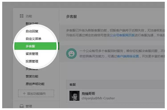 在7月1日后仍未手動(dòng)升級的舊版多客服的用戶,公眾平臺將自動(dòng)為其升級到新版網(wǎng)頁功能,舊版多客服將失效。自動(dòng)升級的用戶,需要登錄微信公眾平臺,在“功能 - 客服功能”頁面中,為客服帳號綁定對應(yīng)的客服人員微信號,綁定后才可使用網(wǎng)頁版客服功能進(jìn)行客服服務(wù)。