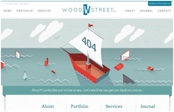 Woodstreet的404頁面也證明了他們的能力,它404頁面中的“Ahoy”讓人似乎聽到了海上人們的吶喊,漂浮的船只、隱現(xiàn)的鯊魚鰭,甚至還有幾臺辦公設(shè)備。讓原本焦躁的用戶慢慢平靜了下來,被Woodstreet的設(shè)計吸引。