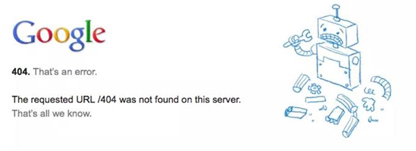 谷歌是一家位于美國的跨國科技企業(yè),成立于1998年9月4日,是國內(nèi)外公認(rèn)的全球最大的搜索引擎。Google在不同節(jié)日的Logo設(shè)計一直別出心裁,而它的404頁面也不例外。對于大家來說最熟悉的,可能就是這幅手繪風(fēng)格的機器人。