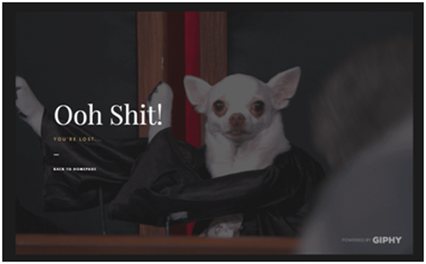 設(shè)計公司Dogstudio的404頁面上有一個狗狗動圖,似乎狗狗真的說了“Ooh shit!”(表不滿),將人們看到404錯誤頁面時的不爽表現(xiàn)了出來。相信看到這么個錯誤頁面,你的不滿會瞬間消失。