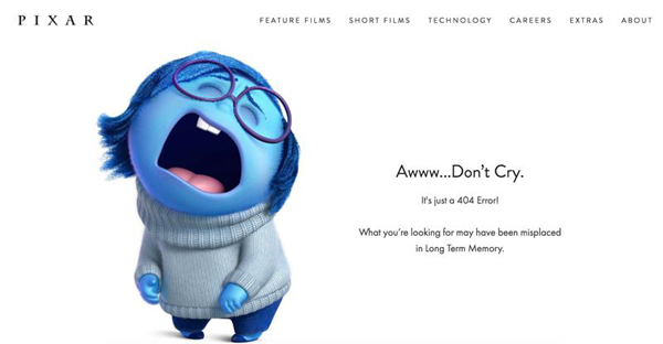 當(dāng)你在Pixar的網(wǎng)站上迷失以后,會出現(xiàn)上圖這么一個404錯誤頁面,頁面里藍(lán)色哭泣小人是Pixar著名動畫《頭腦特工隊》里的主人公之一憂憂(Sadness),她似乎感受到了用戶的悲傷。憂憂旁邊還有一句俏皮話“不要傷心,你要找的頁面可能已經(jīng)丟失在‘長期記憶’ 中了”,相信再沮喪的用戶看到了這么一個具有感染力,又貼心的畫面,也會被逗笑吧。