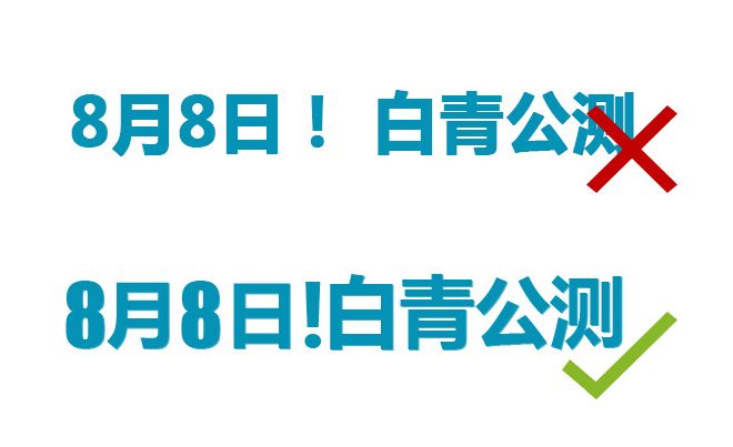 上圖打叉的是我們經(jīng)常忽略的小細節(jié),用系統(tǒng)默認字體的大小打完專題,你會發(fā)現(xiàn)其實中文和英文的大小是不一樣的,上圖數(shù)字“8”相比較“月”和“日”明顯略小,這樣,標題會有種上下起伏的感覺,不穩(wěn)當,第二個是字的間距,默認打完嘆號離文字過遠,直接斷開了2句話,有必要去調(diào)整下字的間距,調(diào)整后字號也變得更大空間得到合理運用!