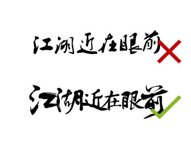 錯誤的示意里我們選用了一款常用的書法字體,當然結(jié)果是不理想的,也許項目會反饋你不夠大氣,無論在筆觸上,字形上都不是一個很好的選擇,但是現(xiàn)有的字體無法滿足你的要求,怎么辦,你可以利用一些在線書法生成一些毛筆字,但是要注意的是生成的很多字在筆觸粗細上都不一樣,很容易讓你幾個字放在一起看著很別捏,如果你沒有很好的書法基礎,你需要多下載一些書法筆觸,找出一些字特點并移植到你選中的另外幾個字上,在適當?shù)牡胤郊哟止P觸,這也是一個慢慢磨的過程,但是能提高不少作品的品質(zhì)感!