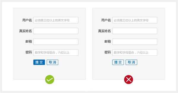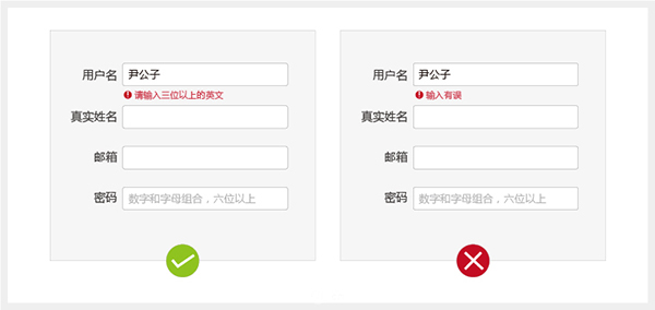 并非每一個用戶都細心的,畢竟人無完人,用戶在填寫表單的過程中,難免會輸錯信息,而這時適當的提示就顯得非常重要,隨意對于輸入錯誤的信息需要有幫助的提醒文本,對于較為復雜的提示文本需要做一個隱藏的圖標。