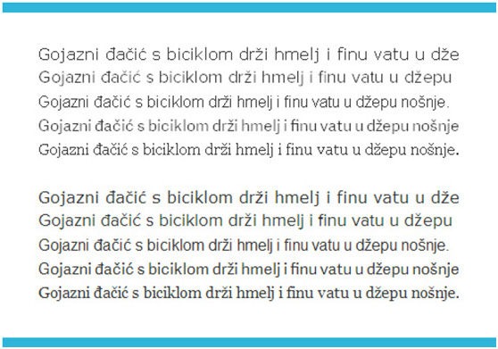 另外一個重要的易讀性測試是為了區(qū)分簡單字體字形之間的區(qū)別。設計師使用全字母短句,或測試短語來評估和對比字體。比如有名的短語“The quick brown fox jumps over the lazy dog”、“Handgloves”、“Hamburgefonstiv”。