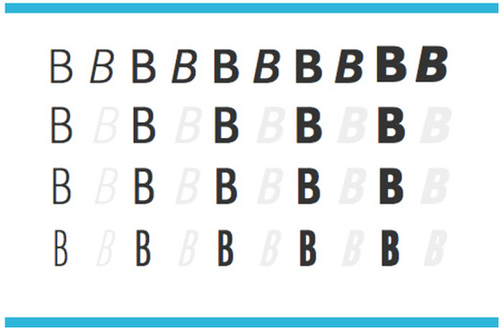 JAF Bernino Sans 有不同的粗細度和寬度。淡化的字母并非真正的斜體,被稱為斜羅馬字體。有的瀏覽器在用CSS快速寫入時能夠使字體變斜。但偽斜體很多時候都被看作違反排版規(guī)則的字體。