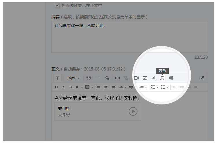 1. 運(yùn)營(yíng)者可以在編輯圖文消息時(shí),在正文中插入音樂(lè)。