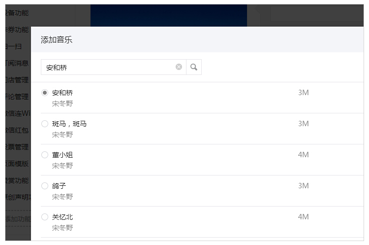 2. 選取音樂(lè)時(shí),支持根據(jù)歌名、作者進(jìn)行搜索,并且可以試聽(tīng)音樂(lè)。