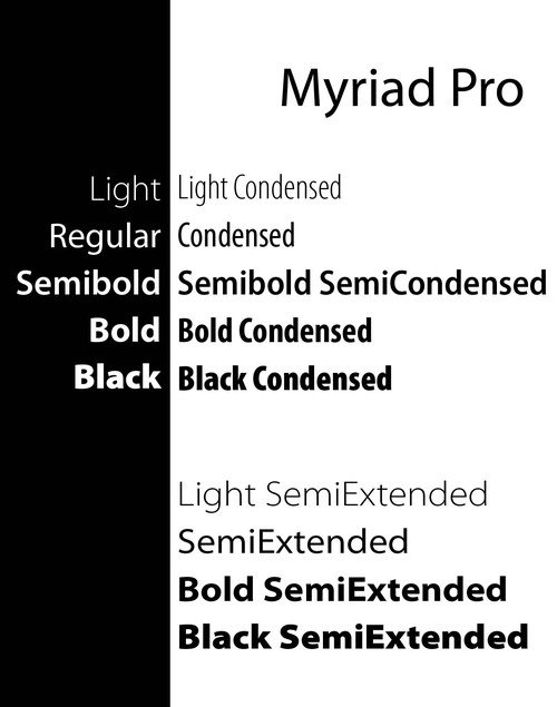 五、比例:比例變化會使家族里出現“瘦”和“胖”的變異,這是對字形橫向或縱向比例的收縮變化,在西文的傳統(tǒng)系統(tǒng)命名中通常會用Condensed(橫向壓縮)和Extended(橫向拉伸)來區(qū)分長和寬兩個類別,這兩種變化可以比較好的處理當空間收到局限時字體的應用,而不會讓字體出現因為進行直接的縮放所而導致的風格變形。