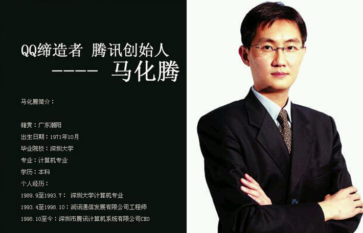 每一個(gè)成功創(chuàng)業(yè)者的背后都會(huì)有一點(diǎn)心酸的故事,因?yàn)槿藗兒芏嗟臅r(shí)候都只能看到事情的表面,只能看到成功人士在成功之后的輝煌,卻往往會(huì)忽視他在成功之前的艱辛付出,就拿馬化騰所創(chuàng)立的如今在國(guó)內(nèi)非常知名的互聯(lián)網(wǎng)綜合服務(wù)商騰訊來(lái)說(shuō),它之所以能夠有今天的成就必定是經(jīng)過(guò)時(shí)間的磨礪,在馬化騰的創(chuàng)業(yè)道路上也必定是布滿荊棘的。馬化騰1971年10月29日生于廣東省汕頭市潮南區(qū),騰訊公司主要?jiǎng)?chuàng)辦人之一,現(xiàn)擔(dān)任騰訊公司控股董事會(huì)主席兼首席執(zhí)行官;全國(guó)青聯(lián)副主席。