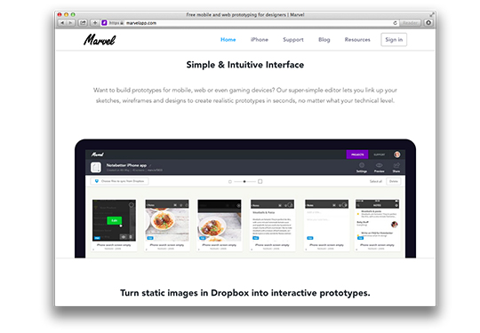Marvel:Marvel是一款免費的原型設計 Web 應用,可以進行網頁設計和移動端的UI設計。和WebFlow一樣,你可以使用Marvel完全在線完成設計,并且可以和你的Dropbox同步,可以方便你進行共享或者分享。值得一提的是,Marvel 支持PSD格式文檔,也就是說你的視覺稿無需轉換格式就可以使用。