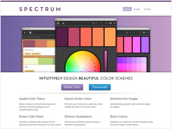 Spectrum:Spectrum是基于OS X的一款應用,能夠非常簡單、直觀地創(chuàng)建色彩定制板。他內置了合理搭配色彩的規(guī)則以及一個能從圖片獲取顏色的取色器,還有內置顏色庫等等。