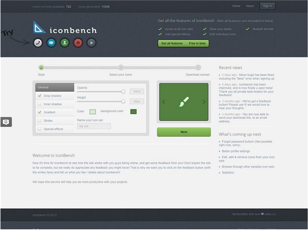 IconBench:IconBench允許你定制一組超過700個的圖標集。你可以設置不透明性,外陰影,內陰影,漸變等效果,然后選擇你最想要的圖標。