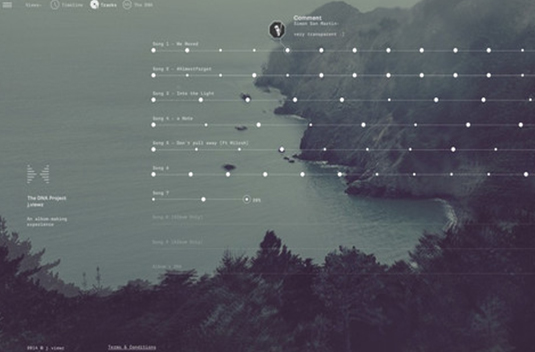 The DNA Project 是一個(gè)極為創(chuàng)新的音樂網(wǎng)站項(xiàng)目,它為用戶提供了截然不同的音樂制作流程,時(shí)尚又不同凡響。每首歌都被劃分為關(guān)鍵的音樂節(jié)點(diǎn)、音軌背后的故事和參與的音樂家等幾個(gè)部分,這個(gè)項(xiàng)目讓用戶與音樂人們一同制作音樂。