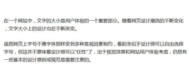 行寬:大家可以試著想像一下,如果一行文字過長,視線移動距離長,很難讓人注意到段落起點和終點,增加閱讀的難度;如果一行文字過短,眼睛需要不停的來回掃視,就會破壞閱讀節(jié)奏。因此我們可以讓內(nèi)容區(qū)的每一行承載合適的字數(shù),來提高易讀性,傳統(tǒng)圖書排版每行最佳字符數(shù)是55-75,實際在網(wǎng)頁上每行字符75-85更流行,中文在14號字體時,建議35-45個文字。
