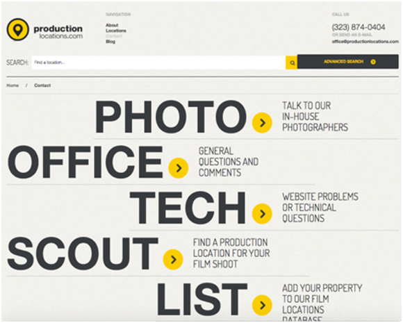 看起來(lái)好看的網(wǎng)頁(yè)頁(yè)面設(shè)計(jì)并不能說(shuō)是一個(gè)成功的網(wǎng)站設(shè)計(jì),最主要的是能夠迎合用戶(hù),能夠有良好的用戶(hù)體驗(yàn),是屬于用戶(hù)友好型的。如:Productiong Location的聯(lián)系我們頁(yè)面采用了大膽而視覺(jué)化的頁(yè)面設(shè)計(jì),但是和其他的同類(lèi)頁(yè)面不同的是,它簡(jiǎn)化了溝通流程,把用戶(hù)可能會(huì)關(guān)注的內(nèi)容和需要溝通的具體部分都劃分了一下,讓不同需求的用戶(hù)直接被引導(dǎo)到特定的頁(yè)面和部分,從而達(dá)成簡(jiǎn)化和分流的目的。