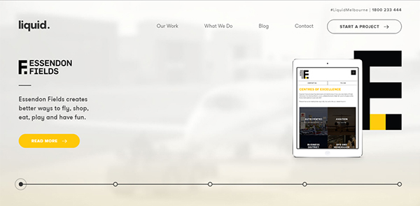 Liquid Agency 最拿手的就是在創(chuàng)造獨特的品牌體驗上,這一點從他們的官網上就可以看出來,黑白灰+提亮的黃色,橫向瀏覽的布局和恰到好處的留白,都是網站令人過目不忘的細節(jié)。