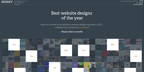 當(dāng)進入網(wǎng)站后界面以后,你會發(fā)現(xiàn)MMXV網(wǎng)站中并不存在多余的介紹和花里胡俏的裝飾,有一行關(guān)于網(wǎng)站主人zitrusfrisch 的介紹,他是一個國外服務(wù)類產(chǎn)品中非常有威望的設(shè)計師,榜單的收集和網(wǎng)站的視覺設(shè)計都是由他一人完成的,非常良心。