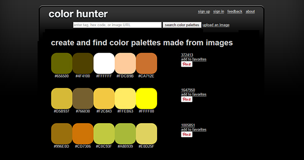 ColorHunter在線配色篩選工具是一個(gè)可以按照圖片來自動(dòng)生成相應(yīng)的不同調(diào)色板,也就是配色方案。如果你想尋找某種風(fēng)格的配色方案,可以在網(wǎng)站上方的搜索區(qū)域進(jìn)行相應(yīng)的搜索。除了根據(jù)圖片來尋找配色外,你還可以輸入tag名稱、16進(jìn)制顏色值或Flickr網(wǎng)站中的照片(圖片)網(wǎng)址進(jìn)行搜索。