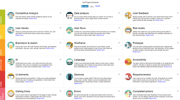 當(dāng)你在工作中創(chuàng)建并開始了一個UX項(xiàng)目的時候,你必須得保證每一步都做得非常的到位,保證你在整個過程中不忘記任何事情,對于每一個細(xì)節(jié)的把控都非常的到位,UXchecklist將會非常有效的幫助你列舉出你正在進(jìn)行著的步驟,這樣的話在一定的程度上它能夠幫助你贏的一些晚上的睡眠時間哦!