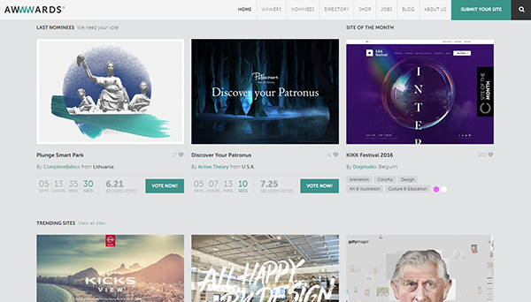 Awwwards是一個專門為設(shè)計(jì)精美的網(wǎng)站以及富有創(chuàng)意的網(wǎng)站頒獎的網(wǎng)站,Awwwards上的獲獎網(wǎng)站來自全世界優(yōu)秀的網(wǎng)頁設(shè)計(jì)師之手,網(wǎng)站每天評選出一個“Site of the Day”。如果您想增加自己的視野,想提升自己的設(shè)計(jì)水平,想學(xué)習(xí)國外優(yōu)秀設(shè)計(jì)網(wǎng)站的設(shè)計(jì)思路,Awwwards一定可以幫到你,在這里你可以找到大量的實(shí)例。