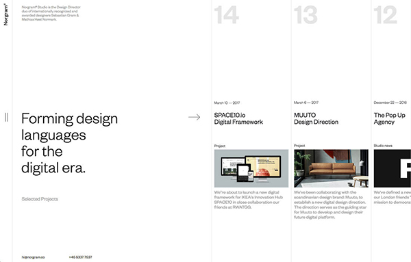 當(dāng)你⑴次瀏覽一個(gè)采用水平滾動(dòng)導(dǎo)航的網(wǎng)站時(shí),體驗(yàn)起來可能會(huì)覺得非常的奇怪,首先它的物理和視覺運(yùn)動(dòng)方向和常規(guī)的縱向滾動(dòng)不同,而且當(dāng)你使用鼠標(biāo)滾輪滾動(dòng)的時(shí)候,這種交互的錯(cuò)位感會(huì)極其強(qiáng)烈。其實(shí),想要解決這個(gè)問題,需要設(shè)計(jì)師加入視覺線索來幫助用戶導(dǎo)航,強(qiáng)化瀏覽邏輯和體驗(yàn)即可。
