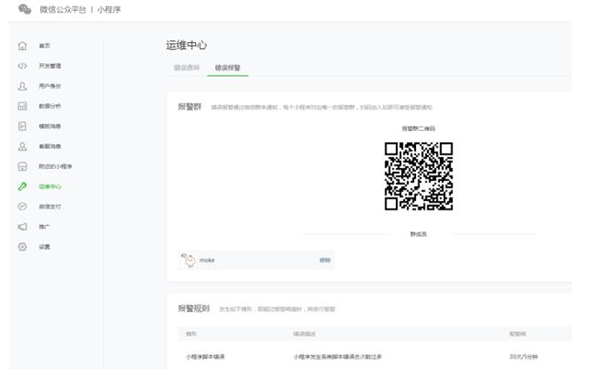 在運(yùn)維中心,開發(fā)者可掃描二維碼加入小程序報警群。當(dāng)小程序在運(yùn)行中出現(xiàn)問題時,系統(tǒng)會推送信息告知報警群內(nèi)的成員。