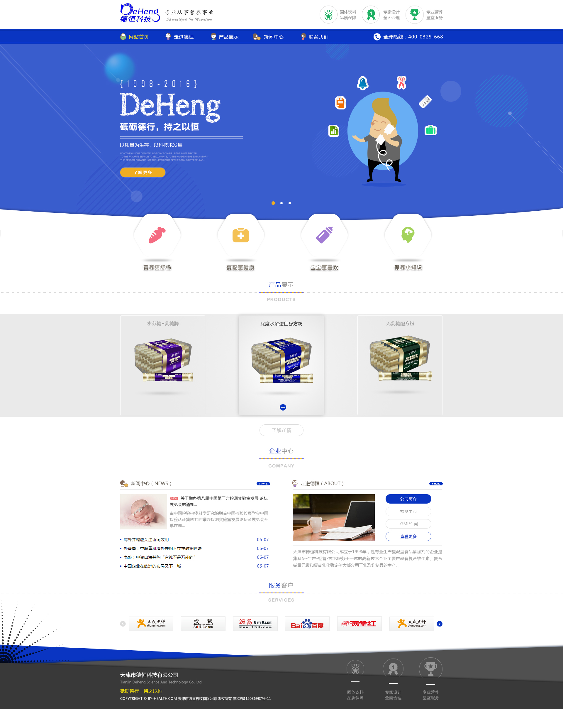 天津市德恒科技有限公司成立于1998年,是專注生產(chǎn)復(fù)配型食品添加劑的企業(yè),是集科研-生產(chǎn)-經(jīng)營-技術(shù)服務(wù)于一體的高新技術(shù)企業(yè)。主要產(chǎn)品有復(fù)合維生素、復(fù)合微量元素和復(fù)合乳化穩(wěn)定劑,大部分用于乳及乳制品的生產(chǎn)??蛻舯榧皣鴥?nèi)近200余家企業(yè)。生產(chǎn)品種數(shù)百個(gè),主要應(yīng)用于各種配方奶粉、液體奶、乳飲料、豆奶粉、面粉、營養(yǎng)補(bǔ)充劑及臨床病人用的全營養(yǎng)流食等。公司主要產(chǎn)品是孕產(chǎn)婦營養(yǎng)包、固體飲料營養(yǎng)包。